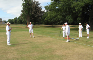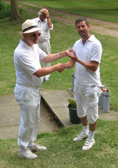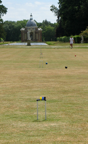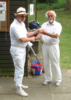 The influence of the World Cup came into play at the conclusion of the tournament, which was decided by croquet’s equivalent of a penalty shoot-out. Four players had finished with only two losses, these being Nigel Polhill (8/10), Cliff Jones (7/9), Nick Mounfield (6/8) and George Collin (5/7). Nigel had beaten George but lost to Cliff and Nick, Cliff had beaten Nigel and Nick but lost to George, Nick had beaten Nigel and George but lost to Cliff and George had beaten Cliff and lost to Nigel and Nick. All of them had four shots at the peg and Cliff was the only one to register a hit, so he took the trophy with Nick (3) receiving the prize for the best performance in the group of eight players with handicaps of two or more. As in May, the weather was hot and sunny, and the lack of rain in the preceding week left the lawns fast and tricky.