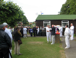 Somerset captain David Goacher receives the Inter County Championship trophy from Colin Irwin. Tom and Judy Anderson can be seen in the background.