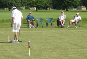 There was a bottle of champagne on offer for the first TP on the new Wrest Park lawns (as the odds were short enough we had said that TPOs wouldn’t count). Bryan, our captain and a generous host, agreed to go the full three rounds, and following the doubles he was on the receiving end when Mark Avery claimed it. Vic Rees, spectating with John Wheeler, said that the first TP on the old Wrest Park lawns was done by Keith Wylie. In the other top singles Robert had laid for a sextuple against George, who hit the long shot and made a few hoops before the end. John was first to 4-