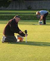 The team during the early stages of the last match against Hampshire. Jon Watson shows David Marsh how it’s done, Bryan Harral and Tim Brewer (seated) settle for a wide join across the corner, and Tom and Howard are transfixed by their opponents’ play