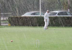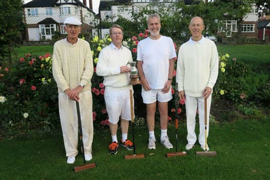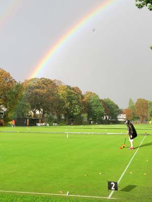 Saturday morning began with sunshine and mist, but the rain had set in by the time Tim had driven us to Surbiton by 9.15. The sun came out before lunchtime, but later in the afternoon heavy showers returned with the accompaniment of a superb double rainbow, finally easing off in time for the presentation. In the doubles our missed roquets and the opponent’s blobbed hoops kept the game going longer than was really necessary, but George’s clean hoop running put us well ahead.