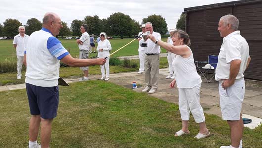 Six pairs entered this tournament. It was not feasible to carry out a draw on the day as the present restrictions made it important to fix teams, to assign lawns and to work out an Order of Play beforehand. The outcome was that there were three pairs of married couples and three “odd couples” in contention.