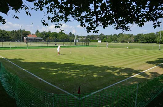 Heather Bennett in play during the morning doubles at St Albans, with the tennis courts, cricket field and pavilion in the background.