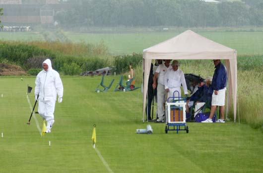 The weather was fine for the most part, but a heavy shower on Sunday afternoon had the players socially undistanced as they all took shelter under the courtside gazebo. Our thanks to Eric Audsley for management and to Eric, George and John for giving the lawns another cut after play on Saturday.