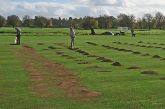 As expected, ten tons was more than enough. Some had already been applied to level off significant dips and a repaired sinkhole that had appeared between lawns 2 and 3, some was transferred to sacks and the rest left in situ covered with tarpaulins. Many thanks to all who helped, especially to George, Gill and Peter, who resembled a trio of shire horses pulling a harrow as they stolidly plodded back and forth with the dragmat, trailing a cloud of dust.