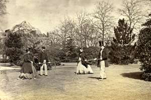 Garden croquet in the 1860s. Note the size of the hoops and the ball destined for the shrubbery.